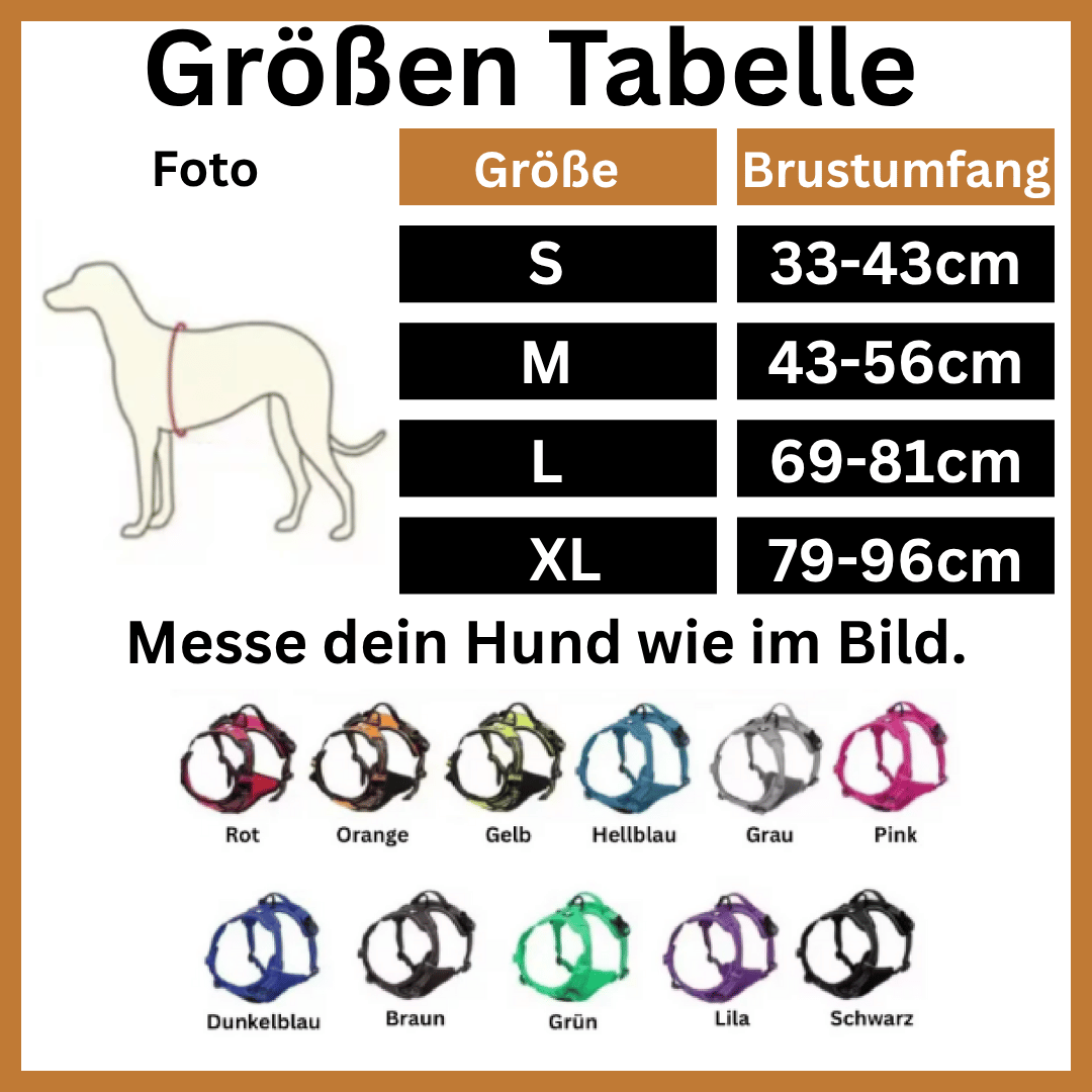 Mit vier Größen findest du für deinen Liebling das ideale Geschirr – einfach den Brustumfang messen und die passende Größe wählen.